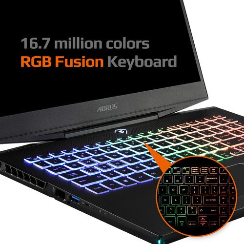 The AORUS RGB FUSION keyboard features three-zone backlit control.