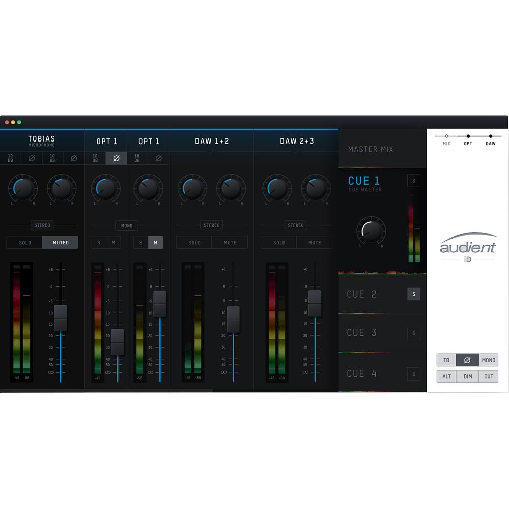 The iD44 offers console-style monitor control, which is inspired from Audient’s heritage in analog console design. The desktop controller offers a wide range of flexible controls and functions, including dedicated talkback, cut and dim buttons, and polarity, mono, speaker-select, and cue-mix monitoring. The iD44 sports mix-focused software, and an iD Mixer. Create up to four stereo artist cue mixes, name and customize channels, save layout presets, assign hardware function buttons, quickly setup advanced routing, use presets in standalone mode, and more.