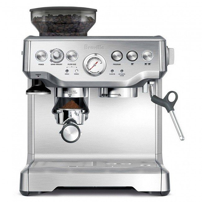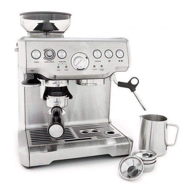 This is the latest version of Breville’s only espresso machine with built-in grinder. Updates from the previous BES860XL model include a dedicated hot water dispenser, updated stainless steel conical burr grinder, hopper styling for smoother operation, and an upgraded drip tray.