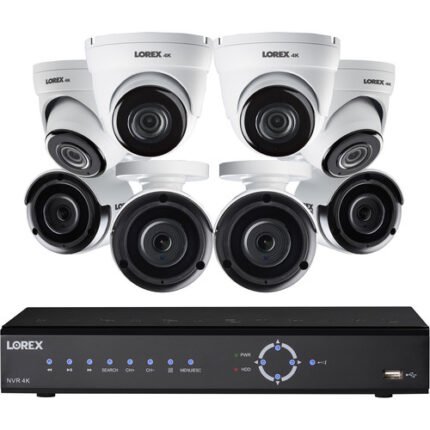 Each of the eight included 4MP mini turret cameras captures 2688 x 1520 resolution video at 20 fps in a 104 x 57° field of view using its 2.8mm fixed lens. For areas you’d like to monitor at even higher resolution, each of the four included 8MP mini dome cameras captures 3840 x 2160 video at 15 fps from a 2.8mm fixed lens with a 112 x 69° field of view. All four cameras are equipped with built-in IR LEDs that provide a night vision range of up to 98′. Designed for outdoor use, the cameras are housed in IP67-rated weather-resistant enclosures.