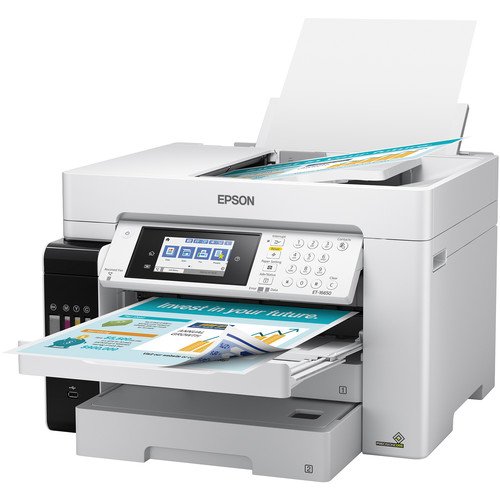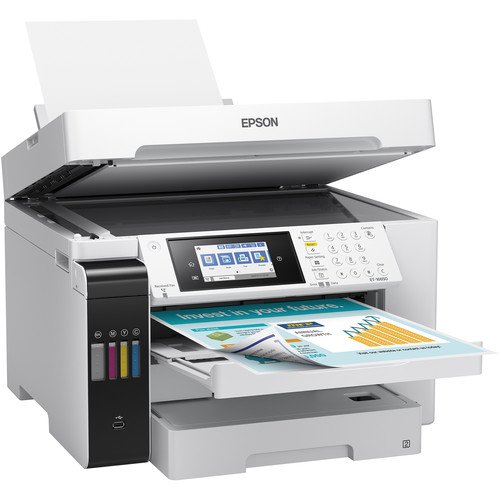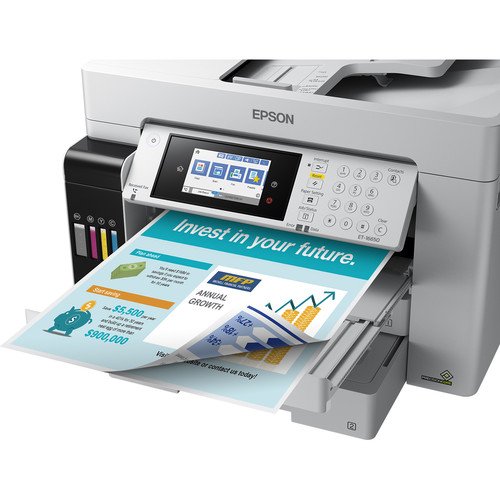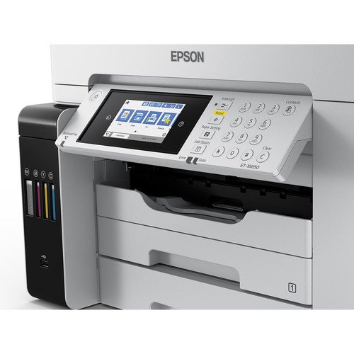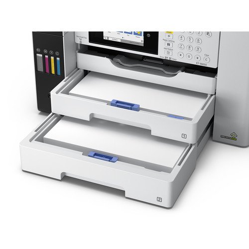 Two 250-sheet input trays work with documents up to 11 x 17″, and a long-document mode on the rear feed enables the production of media up to 12.95 x 236.2″. For scanning and copying, the unit has a flatbed scanner with an integrated ADF that allows scans up to 11 x 17″, and the optical scan resolution is an impressive 1200 dpi. Settings can be checked and quickly changed via the 4.3″ color touchscreen, and for maximum versatility during setup, the ET-16650 is equipped with USB 2.0, Ethernet, and Wi-Fi connectivity. Additionally, mobile printing is made possible via Apple AirPrint, Mopria, Epson Connect Email Print, and the Epson iPrint Mobile App.