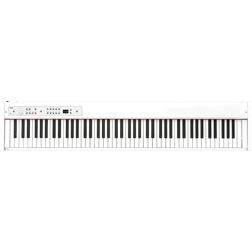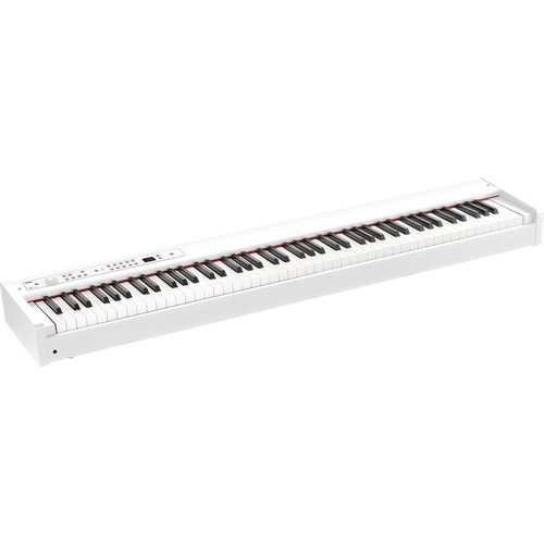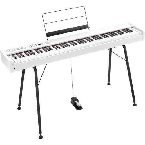The white D1 88-Key Digital Stage Piano with Pedal from Korg is a lightweight keyboard designed without built-in speakers to keep it slim and portable for gigging classical, jazz, rock, or funk players. It can be used when paired with powered speakers or headphones (both available separately) to deliver the playing feel of a grand piano for rehearsal, home, live stage, and recording applications.