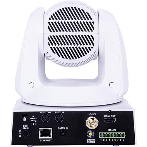 The white CV630-IPW Broadcast Pro AV UHD 4K IP PTZ Camera from Marshall Electronics is designed for professional conferencing applications. Its 8MP sensor captures up to 2160p UHD 4K resolution with a lens with 30x optical zoom from 4.6 to 135mm and a 70° angle of view. Connectivity features include 3G/HD-SDI and HDMI outputs and RJ45 Ethernet streaming and RS-232 serial control.