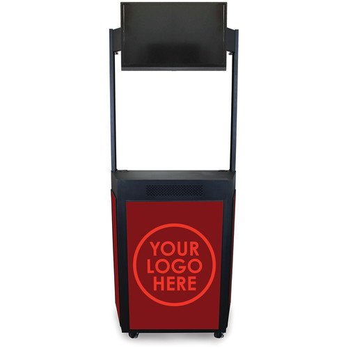 The dark neutral finish Vizion Event Booth with 32″ Flat Panel TV Mount Marquee Header from Marvel is a suitable solution for any school, pro-team, facility, or organization looking to create an interactive touch-point with fans, customers, or supporters. It can be used as a welcome station, information kiosk, promotion station, demonstration booth, fundraising center, ticket booth, and program stand. It features side panels that hold your signage (printed on corrugated plastic, acrylic, or aluminum media). In addition, this event booth offers a telescopic adjustable height marquee header, speaker grille, wire management grommets, storage area with locking cabinet, and 4″ heavy-duty casters (two locking).