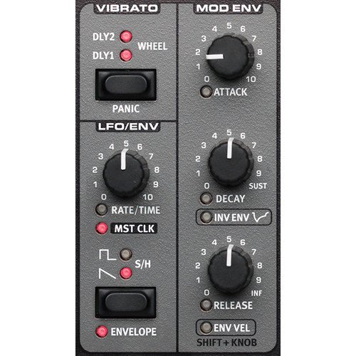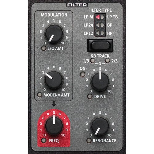 The Nord Lead A1 features their Wave Engine with oscillator configuration shortcuts utilizing two oscillators. Start with a single oscillator waveform (a choice of multiple Analog and Digital waveforms), select an Oscillator Configuration Shortcut – pitch, detune, shape, sync, FM, ring modulation, dual Osc or noise – and use the OSC Control knob to adjust the settings of the configuration.