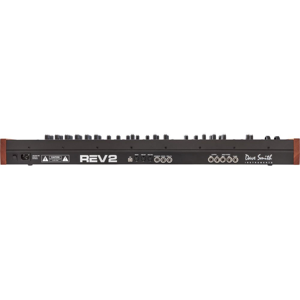 Other notable features include the doubling of the modulation matrix, waveshape modulation on all waveforms, digital effects per layer in stacked or split voice mode, a polyphonic step sequencer per layer and more. The Prophet Rev2 is compatible with any existing libraries or patches from the Prophet ’08. The instrument has inputs for a sustain pedal and expression pedal, which doubles as an input for control voltage for further sonic manipulation. Four 1/4″ unbalanced TS outputs provide audio output, while a stereo 1/4″ headphone connection allows for playing in quiet environments.